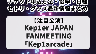 公演・ライブ情報 【Kep1er ファンミ2026 当落】チケット申込方法・倍率・日程・セトリ・グッズ最新情報まとめ Kep1er(ケプラー)のファンミーティング『Kep1er JAPAN FANMEETING「Kep1arcade」』の開催が決定し、日程やチケット情報、当落、倍率が気になっている方も多いのではないでしょうか。本記事では、『Kep1er J... 2026.04.15 公演・ライブ情報